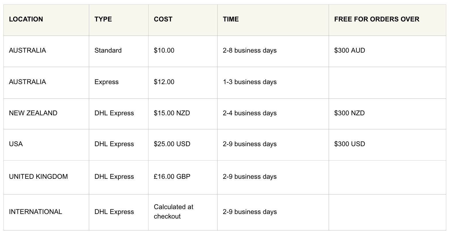 NOTE: Your estimated delivery time is from date of dispatch, which may not necessarily be date of order. Tracking details will be sent to the customer via Auspost or Shippit.