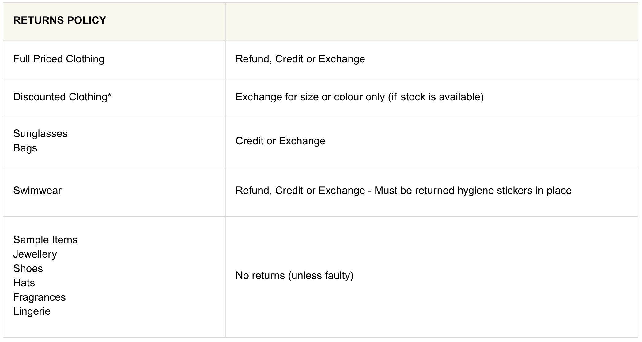 - Our in store policy is as follows: All purchases made in store are final, no refunds will be allowed for any in store purchases. Exchanges or store credit are offered if the request is within 7 days. We can facilitate an exchange or issue a Credit Note which is valid for 4 years from the date of issue, on full priced HANSEN&GRETEL clothing purchased via Cash or EFTPOS. If you suspect that an item you’ve purchased is faulty, please bring it back in and we will try and replace it for you. We do not take returns on ANY items that were purchased at a discount*, or accessories. This includes swimwear, shoes, jewellery, hats, sunglasses, fragrances, watches, and similar products. We also do not accept returns on items bought using Zippay, Credit Notes, or phone payments. *This does not include the 10% off first time purchase code